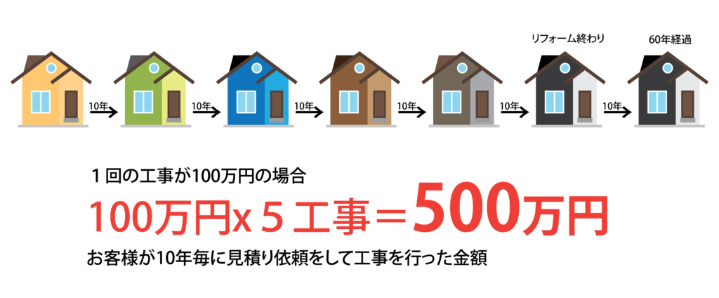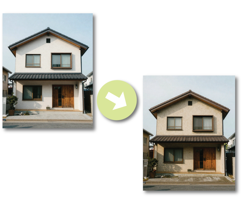 外壁をムキ仕上げで高耐久にして屋根交換を入れました。立地条件などによって設計案は様々ですが細かく説明すると専門的な事が 多いので割愛しています。お得で、よりしっかりとお家を守れるのは間違いなし!将来のお家も見える化で安心!